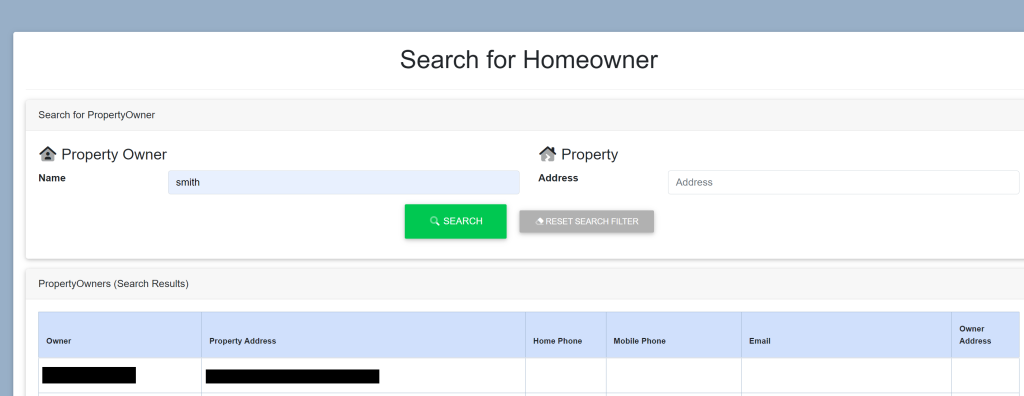 A list of names alongside their properties will appear within the Property Owners (Search Results) box seen here: